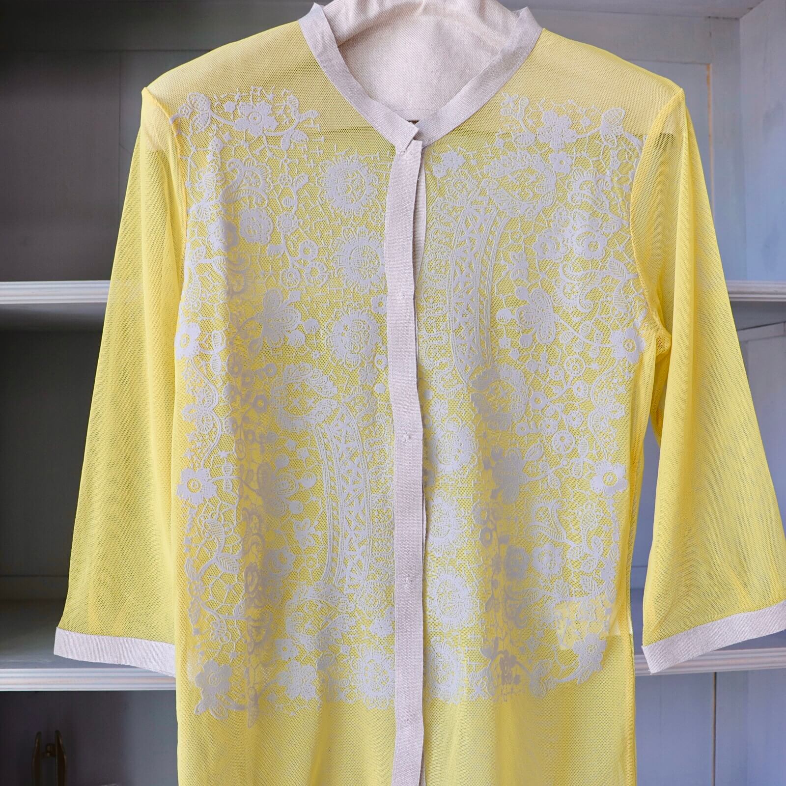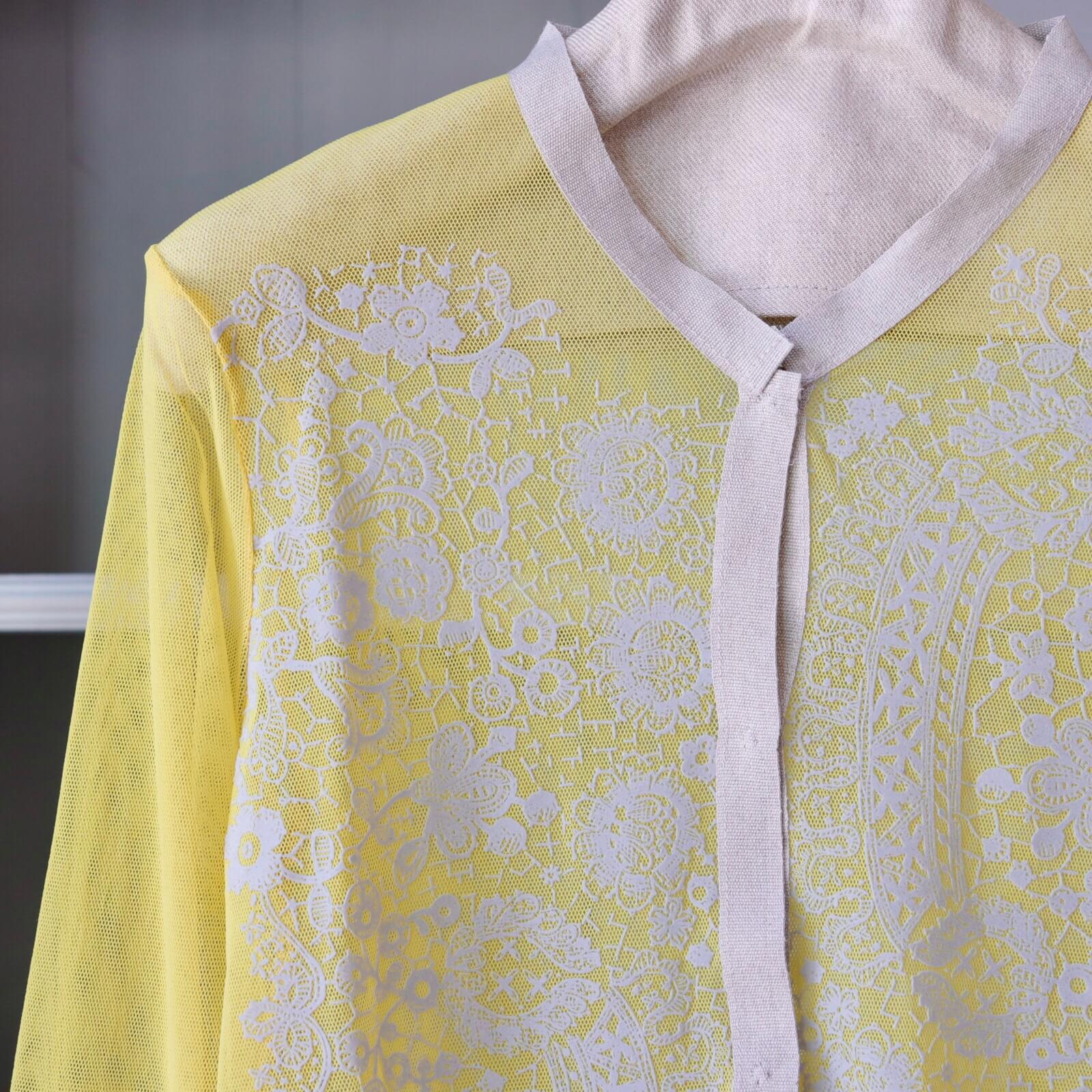 メッシュ生地にレース柄が浮き出るよう、わずかな凹凸感が出るフロック加工が施されており、普通のプリントでは出せない質感がなんとも魅力的な一枚です。