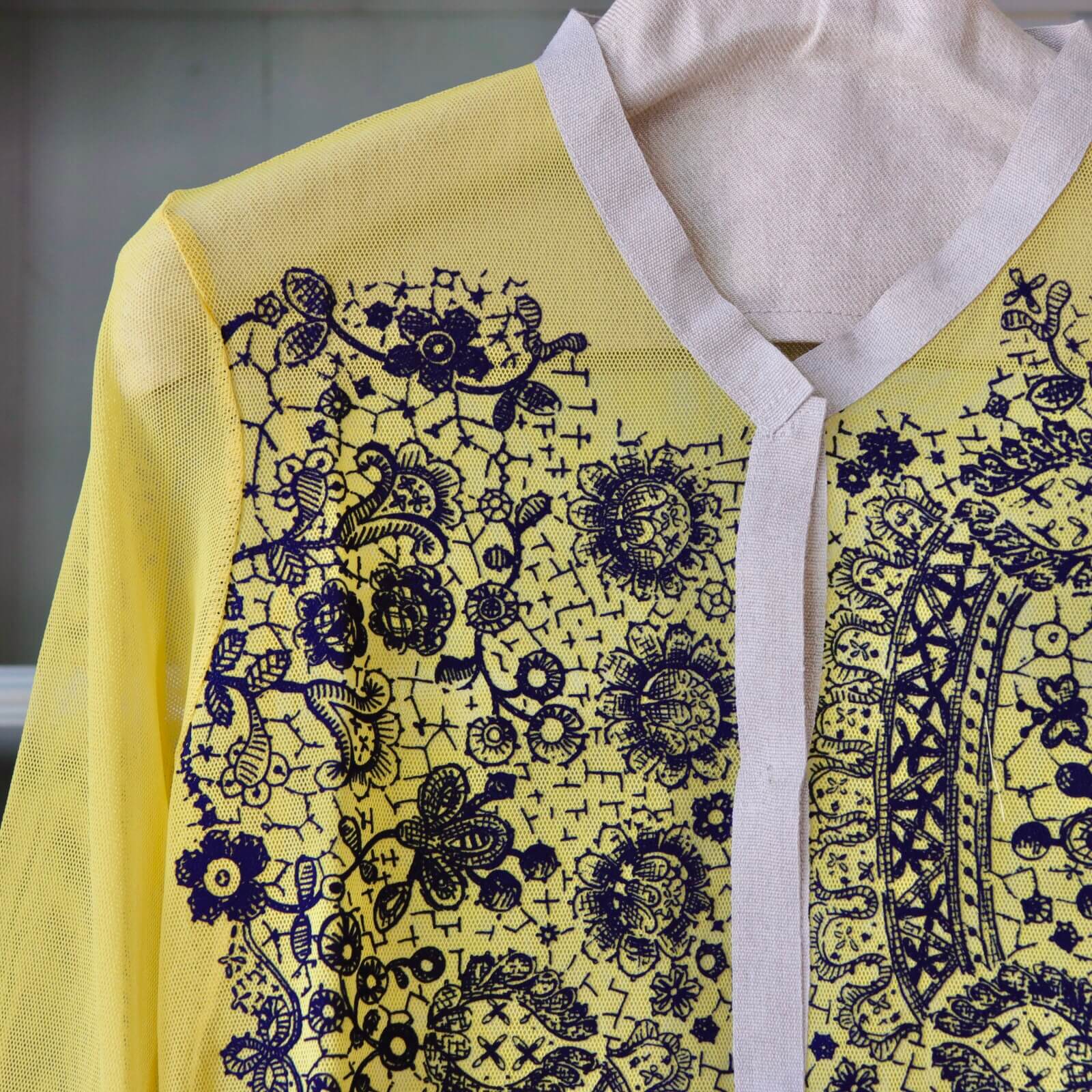 メッシュ生地にレース柄が浮き出るよう、わずかな凹凸感が出るフロック加工が施されており、普通のプリントでは出せない質感がなんとも魅力的な一枚です。