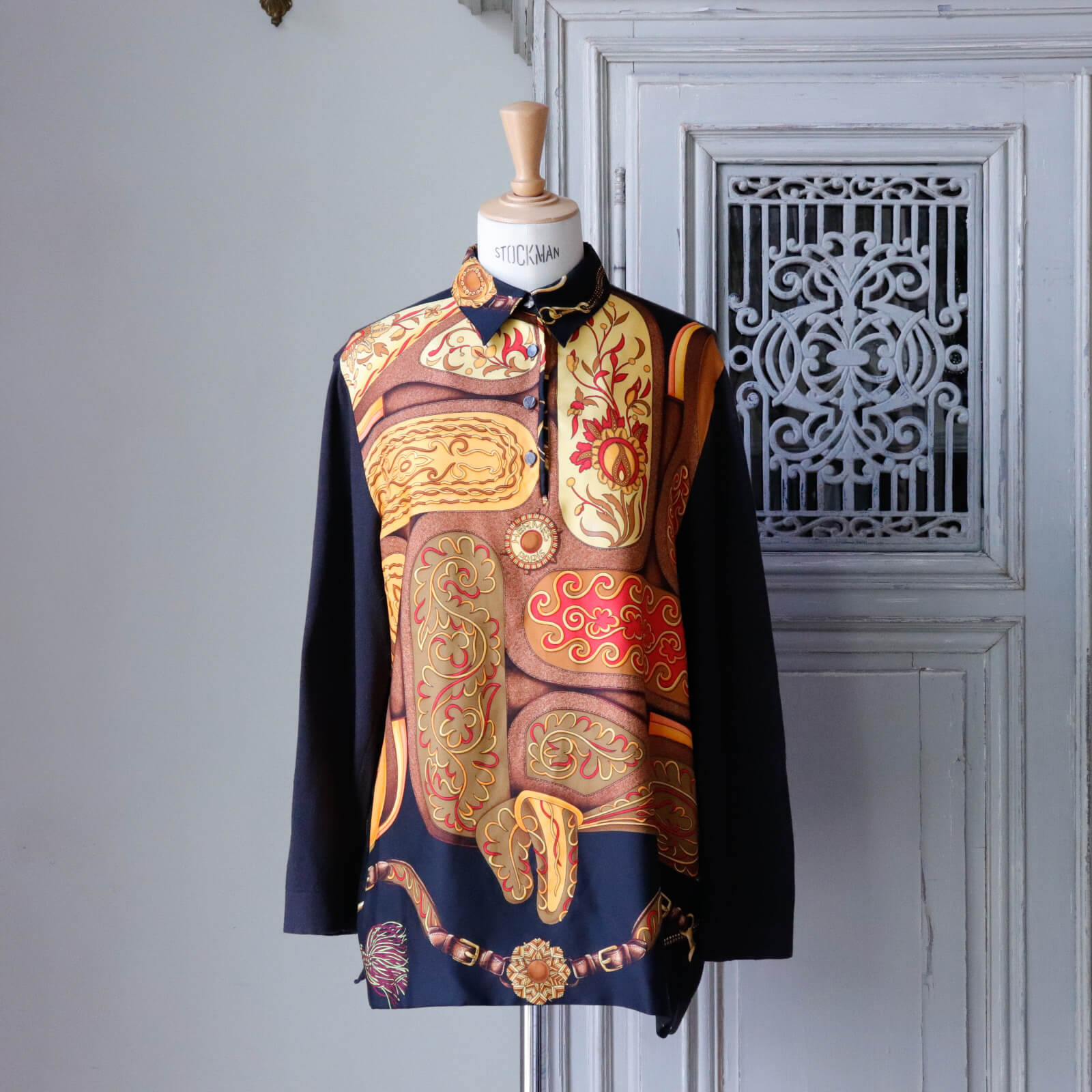 ヴィンテージ「エルメス」マルジェラ期 バンドカラーシルクシャツ「Les Mythologies des Hommes Rouges(褐色の男たちの伝説)