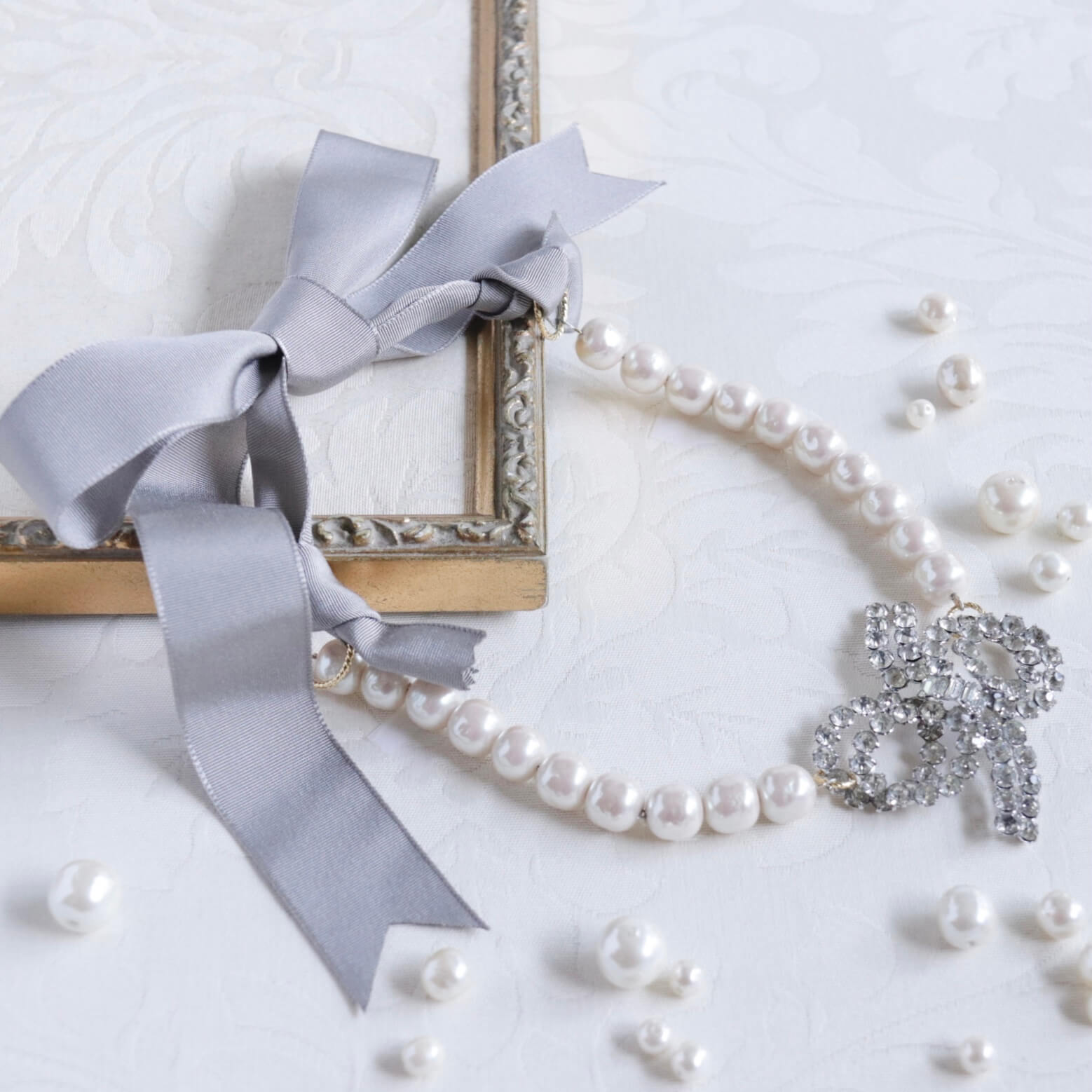 Ninon Original リメイクブローチ リボンパールネックレス Gray